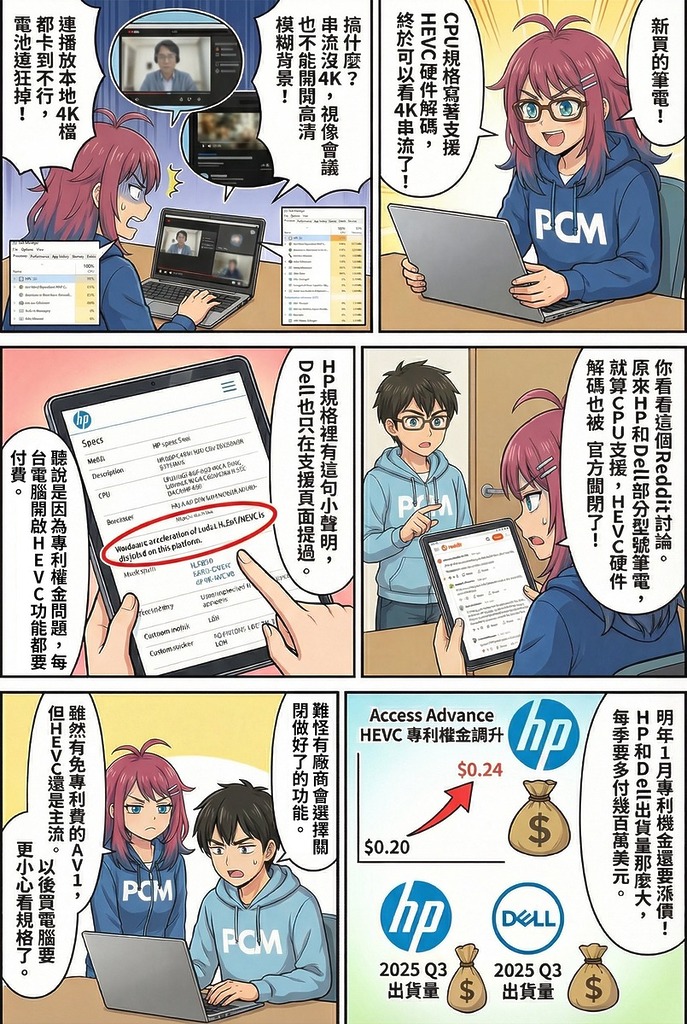 11 月初有網友在Reddit 上報告發現自己的 Dell 二合一筆記簿電腦的HEVC/H.265 硬件編解碼功能被停止了,引發廣泛討論,其後發現有更多 Dell 和 HP 筆記簿電腦出現同樣問題。後來有網友在 HP 的 ProBook 460 G11、ProBook 465 G11、EliteBook 665 G11 三個型號筆記簿電腦的規格裡發現一句細小聲明:「Hardware acceleration of codec H.265/HEVC (High Efficiency Video Coding) is disabled on this platform.(HEVC 編解碼器的硬件加速在這平台被停用)」!而 Dell 則只在支援網頁一篇知識庫文章《如何識別 4K 影片內容是否由於 HEVC 編解碼器而無法檢視》提及只有指定規格的筆電才支援 HEVC 內容串流,包括: