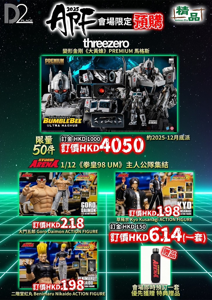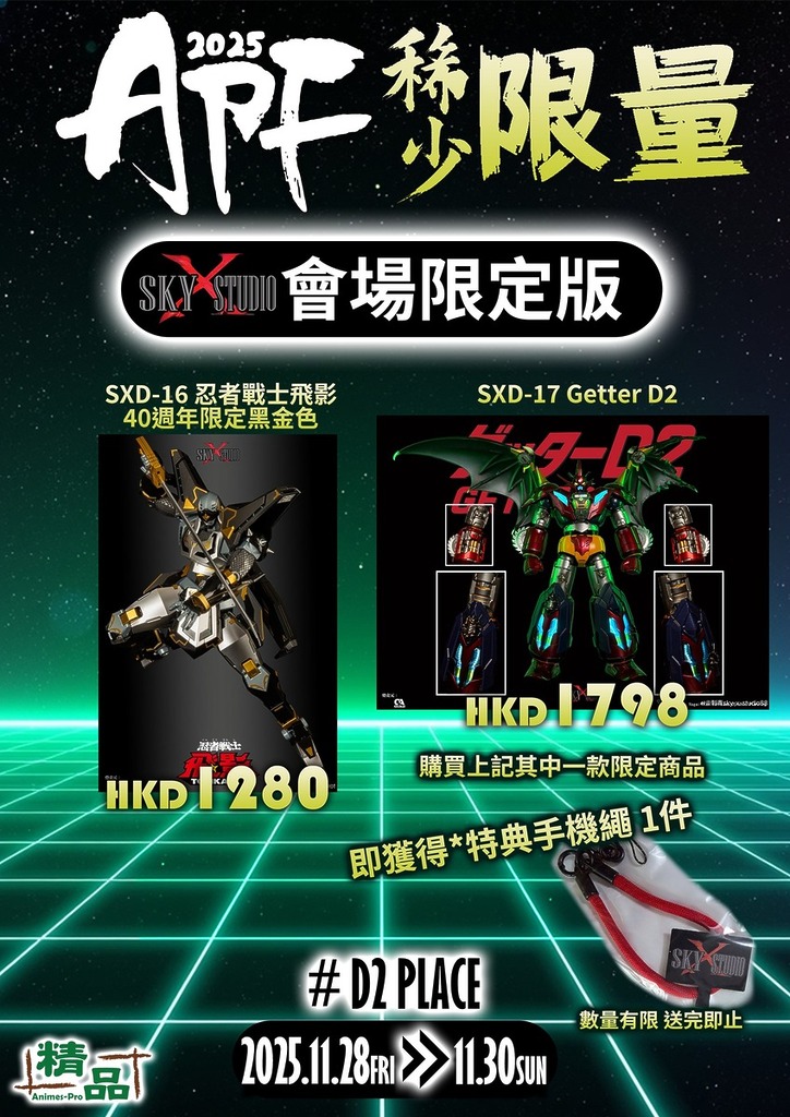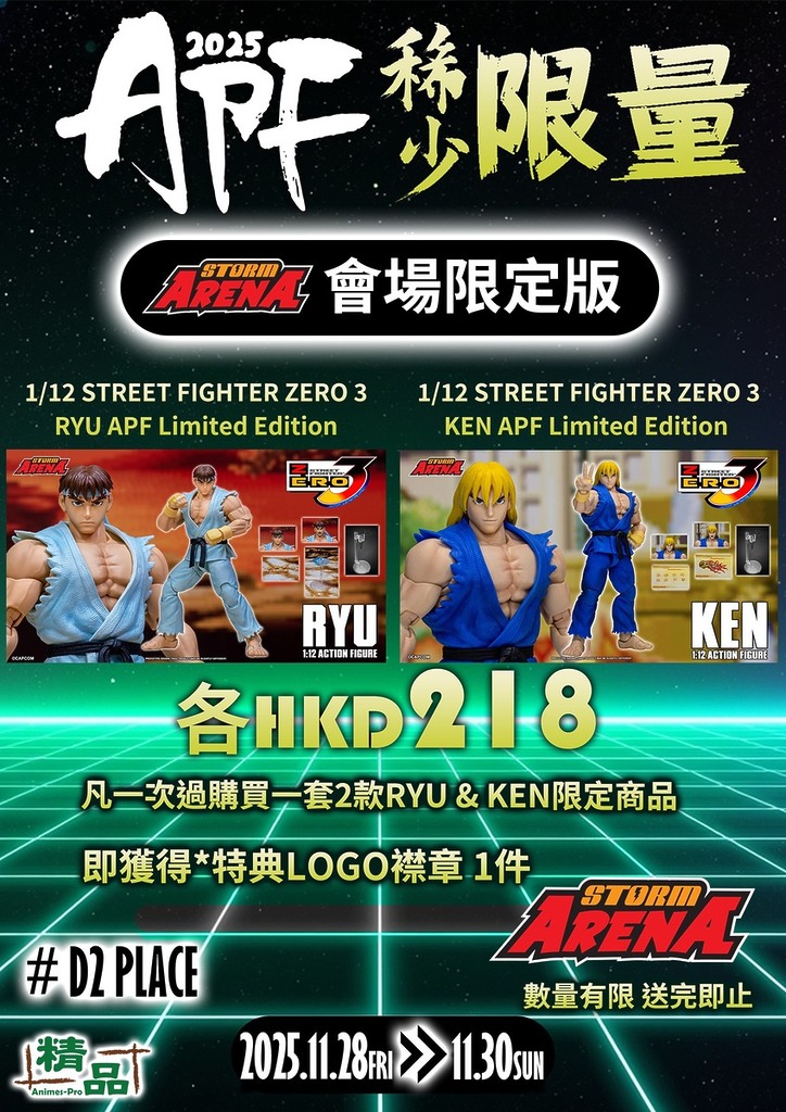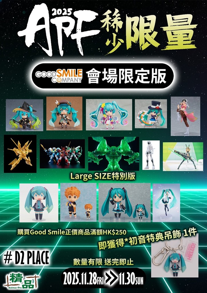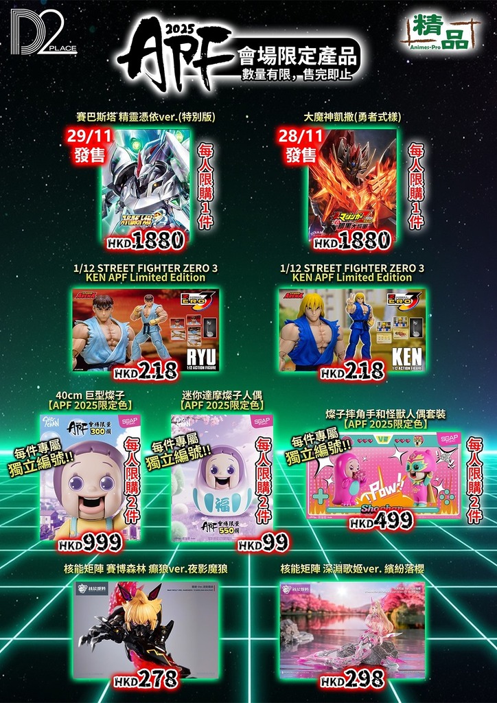 「Animes-Pro Festival 2025」於 2025 年 11 月 28 日至 30 日 假 荔枝角 D2 Place,舉行。集合超過 30 間來自日本、香港及中國內地的頂尖玩具品牌, 包括:Storm Collectibles、Good Smile Company、Kotobukiya、Square Enix、CCSTOYS、Threezero、SOAP STUDIO、Storm Collectibles、Medicom Toy、海洋堂(KAIYODO)、Moshow Toy、Hiya Toys 等多個業界重量級廠牌。媲美暑假的動漫節,眾廠商帶來從未曝光的原型展品、最新塗裝完成品及多款首次亮相的會場限定版本。