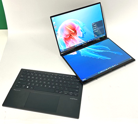 全新的 ASUS Zenbook DUO,採用了兩個全尺寸 OLED 觸控螢幕,配合可拆式全尺寸鍵盤,用家可以使用單屏或雙屏模式來工作。在使用雙屏模式時,可以將機身底部的內建支架拉出,將屏幕托起,甚至可以垂直擺放,方面同時開啟不同的文件及應用,盡享雙屏作業的優勢。雖然新機採用雙屏設計,重量才不過 1.35kg(連鍵盤 1.65kg),便攜性不俗。