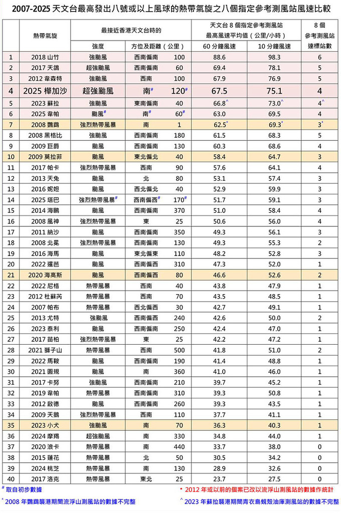 衆所周知,「樺加沙」為香港帶來的風力比「山竹」弱,根據民間氣象組織「香港地下天文台」製作自 2007 年以來的熱帶氣旋平均風力排名表(圖 1),以天文台 8 個指定參考測風站計算,「樺加沙」排名第四,比「山竹」所帶來的平均風力低 24%。