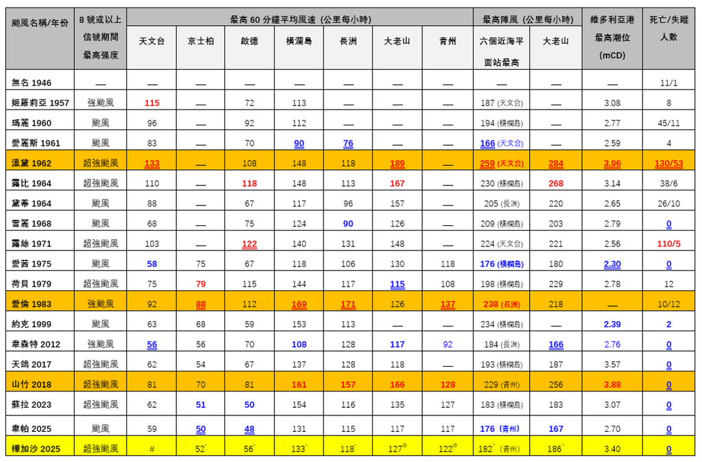 與前一期分析「韋帕」一樣,筆者製作自 1946 年以來,引致發出十號颶風信號的颱風,為香港不同地方帶來的風力和最高潮位,及其所引致的死亡人數,以作綜合比較(注:「樺加沙」的風速為初步估算,最終數據有待天文台公布)。筆者在(圖 2)中將最高和最低值分別以紅色和藍色標示,有雙底綫的是最高/最低值,沒有雙底綫的是第二最高/最低值。