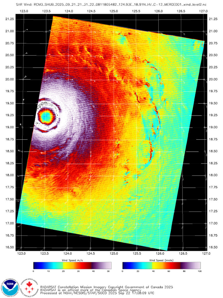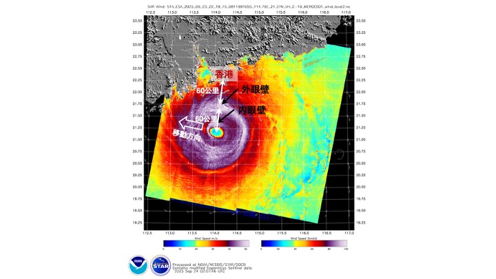 圖 3:加拿大雷達衛星的合成孔徑雷達,在 2025 年 9 月 21 日早上 5 時 31 分所探測到的風速圖像,可見「樺加沙」的雙眼壁。