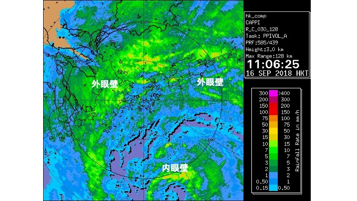 筆者回想 2018 年吹襲香港的「山竹」,就是一個很好的例子⋯⋯當「山竹」在橫過呂宋島進入南海後,受地形影響,「山竹」進行了眼壁置換,令原來較為細小緊密的眼壁(半徑約為 50 公里),被新形成大很多的眼壁(半徑約為 160 公里)所取代,令香港置於眼壁位置附近。結果,雖然「山竹」最接近香港時的距離達 100 公里,但它為香港帶來的風力,比較為接近「山竹」的澳門更强勁。這證明香港當時受「山竹」較强的外眼壁影響(圖 4)。