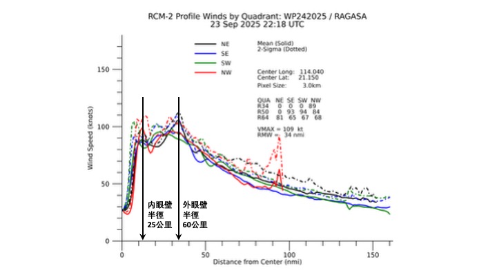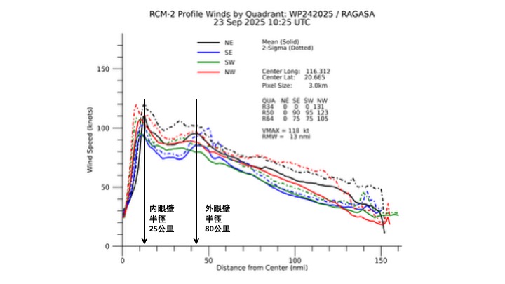 圖 5:加拿大雷達衛星的合成孔徑雷達,於 2025 年 9 月 23 日下午 6 時 25 分在「樺加沙」四個不同象限(東北、東南、西南、西北)所探測到的風速廓綫,可見外眼壁半徑約為 80 公里。