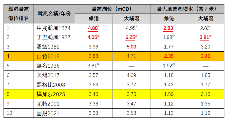 (來源:香港天文台)(# 代表電腦模擬結果;@ 代表利用肉眼參考潮汐桿而估計