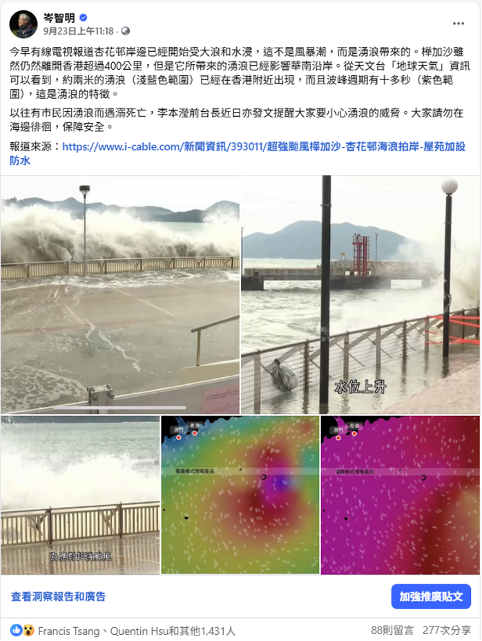 這裏我用「驚濤」和「駭浪」,是指「樺加沙」帶來的「湧浪」和「越堤浪」。在 9 月 23 日上午,當「樺加沙」還在香港 400 公里之外,當時還是 3 號風球,但强勁的湧浪已不知不覺間到來。筆者打開電視新聞報道,看見杏花邨海傍已翻起巨浪,新聞報道員卻沒有作任何解説,深感不妙!於是便馬上在社交媒體提醒大家要提放湧浪的危險(圖 9)。可惜,到下午就收到新聞報道有一家大細在柴灣的一道防波堤觀浪時墮海,幸好得到在場的漁民及時救起,大步檻過!這個「驚濤」凸顯湧浪的危險性,天文台同事經常苦口婆心提醒大家要特別小心!特別是當颱風還在遠處,天氣還相對穩定,甚至仍然風和日麗的時候,以往曾數次出現市民在岸邊被湧浪捲走而死亡的個案。看來,我們還需要加倍努力做更多的公衆教育!
