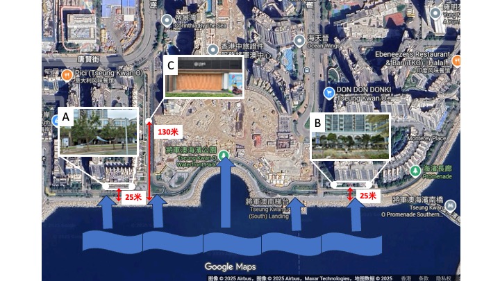 從以上觀察,筆者做了一些基本評估,發現被「越堤浪」摧毀的店鋪(圖 11 中的 A 及B 區)只距離岸邊約 25 米,而在 C 區的店鋪雖然離開岸邊約 130 米,依然有海水湧入。筆者希望這些數據可以幫助當局為受「越堤浪」影響的區域更有效地設計額外的防浪設施,以及在未來的「海岸管理計劃」中更好地規劃海邊的民居、商鋪和其他設施,與海邊保持足夠的距離,進一步減輕在未來可能會出現的「越堤浪」衝擊。