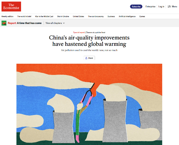《經濟學人》(The Economist)在 2025 年 11 月 3 日,以聳動標題指稱《中國的空氣質量改善加速了全球變暖》“China’s air-quality improvements have hastened global warming”(圖 1),此說法雖部分基於科學現象,卻忽略了整體背景與公共利益的重大意義,必須予以澄清!