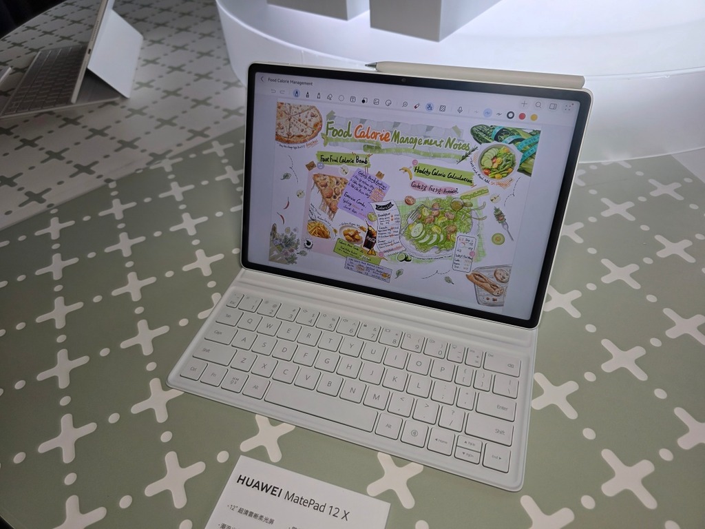MatePad 12 X 配備 12GB RAM、256GB ROM,機身輕薄僅重 555 克、厚度僅 5.9 毫米,適合隨身攜帶。顯示方面採用 PaperMatte 2.0 抗眩光屏幕,有效減低反光,配合 2.8K 解像度及 1,000 nits 高亮度,