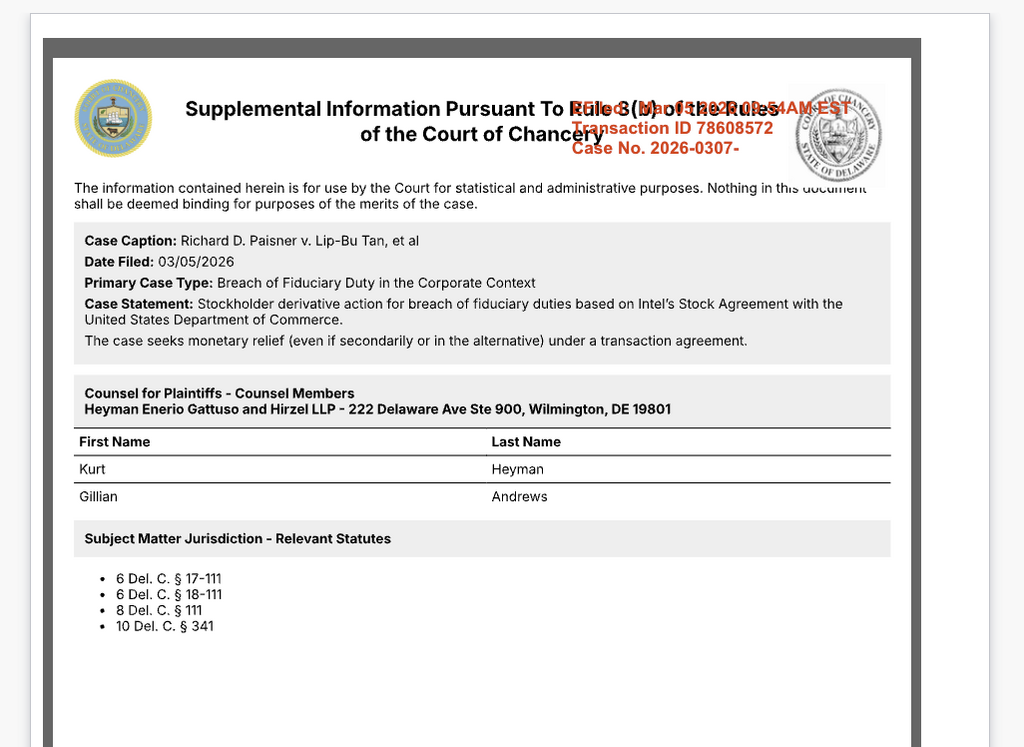 英特爾股東 Richard Pessner 日前入稟特拉華州衡平法院(Delaware’s Chancery Court),起訴英特爾行政總裁陳立武、美國商務部及部長盧特尼克(Howard Lutnick),指控以明顯低於市場價格,向美國政府出售約 10% 股份。