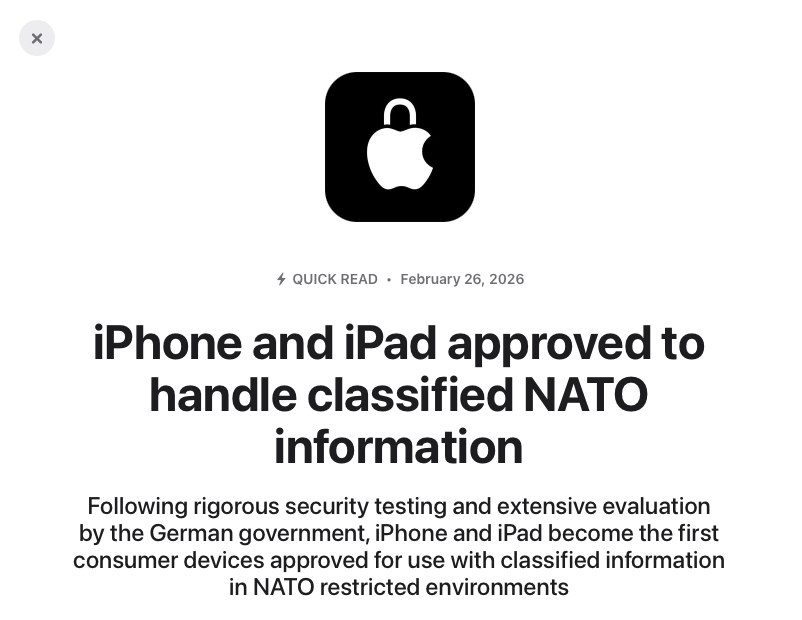 Apple 宣佈,iPhone 和 iPad 在經過德國政府嚴格安全測試及評估後,成為首批、亦是目前唯一獲北約(NATO)認可、可處理涉密資訊的消費級流動裝置,標誌着蘋果在行動裝置安全領域得到了肯定。