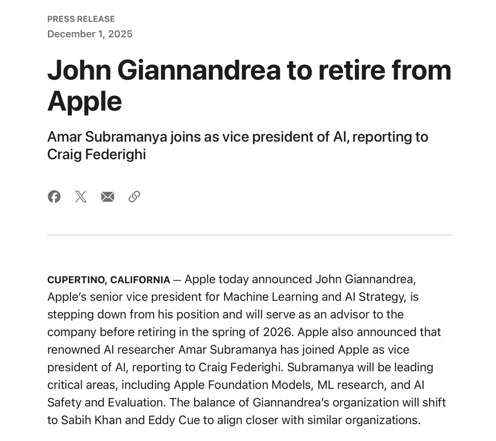 Apple 昨日 (12 月 1 日)公佈,負責機機學習與人工智能策略高級副總裁 John Giannandrea 將會「退休」,2026 年春季完成交接後正式離開公司。接替者是從微軟挖角印度裔企業副總裁 Amar Subramanya,也曾有為 Google 開發 Gemini。到底 John Giannandrea 是以退休為名,實是為 Apple Intelligence 的升級版 Siri 遲遲未面世而問責?