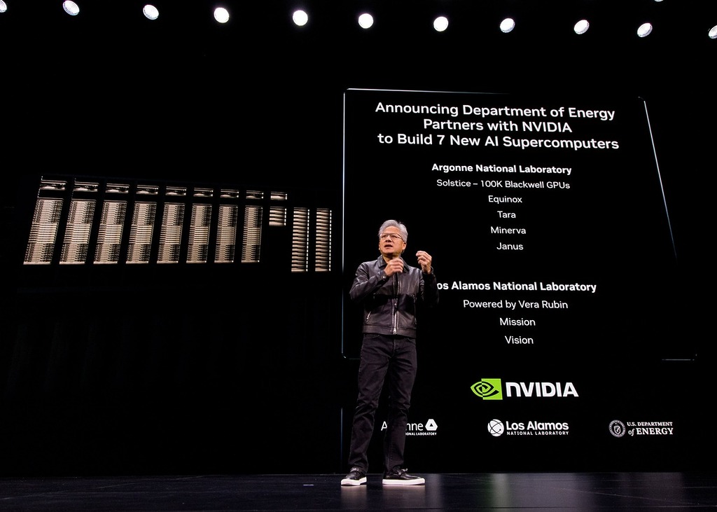 黃仁勳透露,NVIDIA 將與 Oracle 合作,為 DOE 建造七台新型 AI 超級電腦系統,其中最大一台將搭載數萬顆 Blackwell AI 晶片,預計最早於本週開始提供運算能力。這是 DOE 有史以來最大的 AI 基礎設施投資,總規模涉及數百億美元訂單,聚焦於氣候模擬、量子計算、藥物發現與能源優化,例如這類超級電腦能模擬核融合反應,幫助解決全球能源危機;或分析海量基因數據,加速新藥研發,從傳統的數年縮短至數月,潛在拯救數百萬生命。