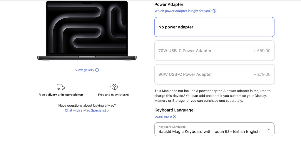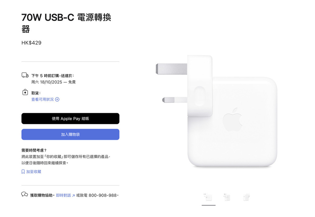就以剛發表的 M5 MacBook Pro 因為例,香港和美國發售的版本,都有提供 70W USB-C 充電器,以及同色 USB-C 充電線。但歐洲版只沒有提供充電器,但售價卻和 M4 版 MacBook Pro 一樣,沒有減去變壓器的差價。用戶要充電,就得另行購買相關的充電器,Apple 原裝 70W USB-C 充電器要 59 英鎊,換算大約港幣 600 元,如果是 96W 則更貴 ,要 79 美鎊。