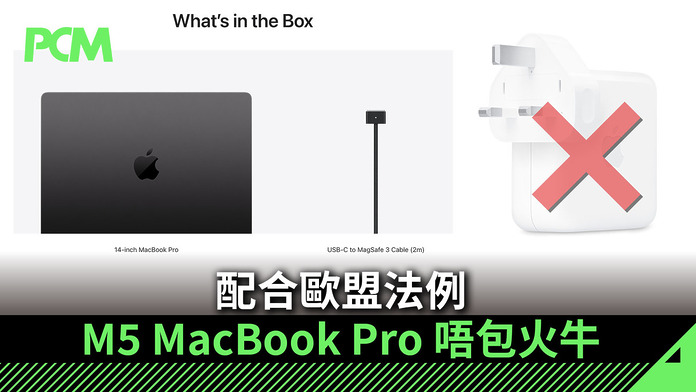 基於環保(或者係節省成本)考慮,Apple 在幾年前開始在 iPhone 產品不再跟充電器(俗稱「火牛」) ,但 iPad 和 MacBook 產品因需要配搭較高輸出功率的火牛,所以一直仍有作為附件。但現在因為歐盟法案,在歐洲和英國購買最新推出的 M5 MacBook Pro 和 iPad Pro,除了要支付更貴機價外,還要另外購買火牛,令買機成本更加高。