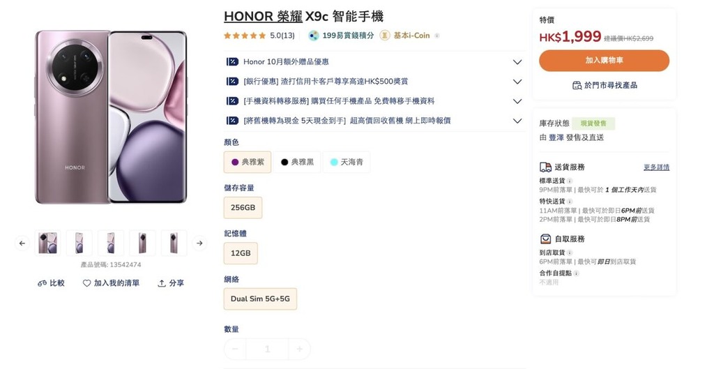是次特價由誠哥電器網店提供,優惠型號包括港版 12+256 儲存組合的典雅紫、典雅黑及天海青三色,消費者需登入易賞錢帳戶方可購買。港版 HONOR X9c 獲得 SGS 金標三防認證,具備 2 米防摔高度及 IP65M 級別防塵抗水功能。手機配備 6,600mAh 大容量電池,採用 Snapdragon 6 Gen 1 處理器,搭載 1.08 億像素 OIS 光學防手震雙鏡頭,並配備 6.78 吋 AMOLED 顯示屏。