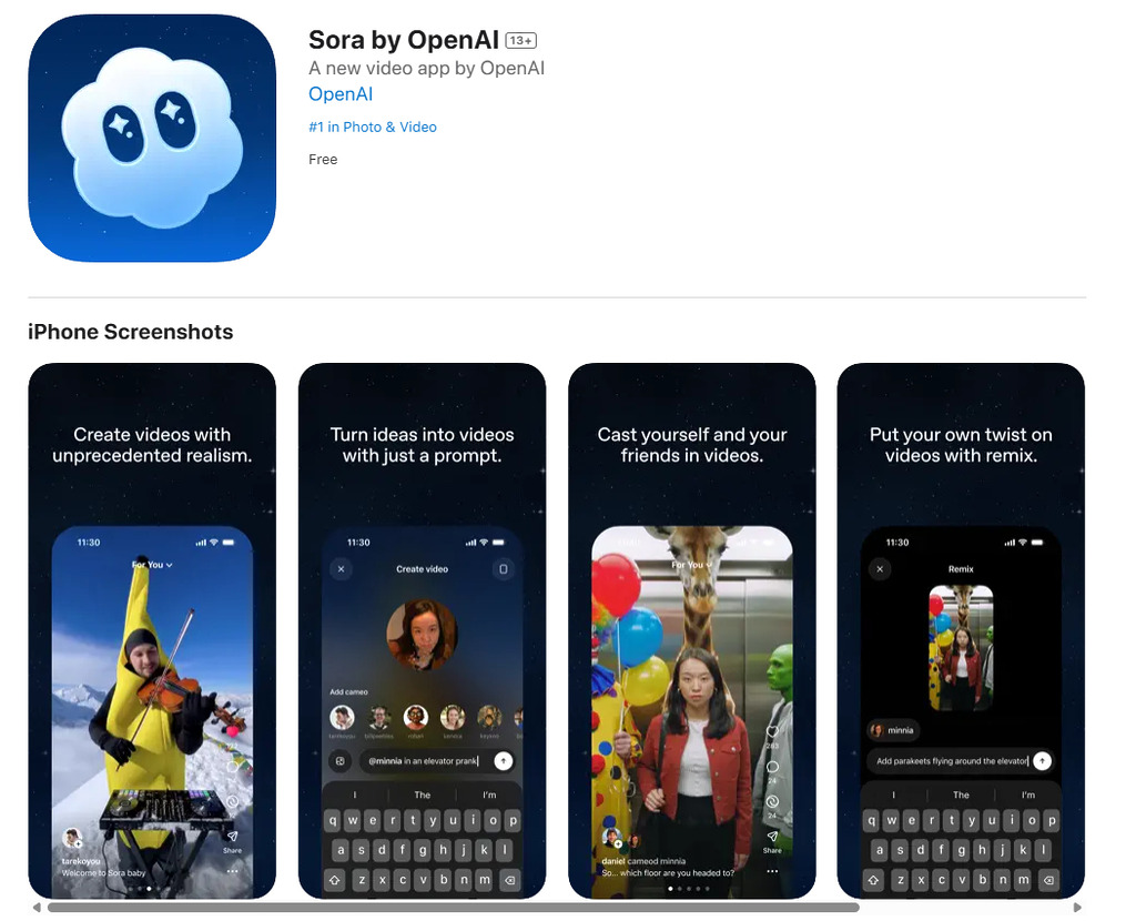 在推出 Sora 2 的同時,OpenAI 推出名為《Sora by OpenAI》的手機應用程式,讓用戶創建、改編視頻,製作可定制的動態消息,並透過「Cameos 客串」功能將自己或朋友加入生成場景。 應用程式強調用戶福祉,提供自然語言推薦算法、每日生成限制(尤其是青少年),以及家長控制功能,如管理無限滾動和訊息設置。「Cameos 客串」功能需得用戶同意,並可隨時撤銷。
