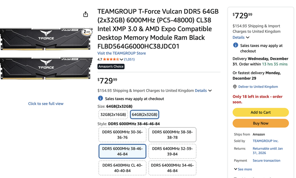 在美國 Amazon 上,有現貨的 DDR5 ( 32GB x2) 記憶體套裝,售價已上升到 729 美元,折合港幣 $5,686 的天價。