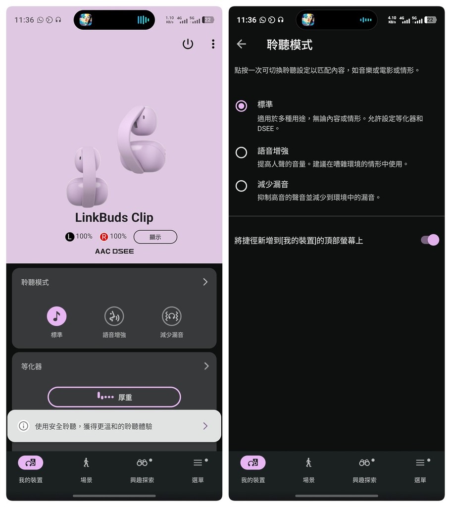 聲音表現方面,在開放式設計下,LinkBuds Clip 的聲壓感覺明顯較入耳式為低,主觀聽感是「耳機聲無入耳咁大聲」,更像在耳邊開住一個細細聲的隨身喇叭,就算有人向你說話,不用按下暫停鍵也能夠清楚聽見對方說話,無論長時間聽歌,或者現時流行的「聽 YouTube」、 Podcast 時都會比較放鬆。低頻方面只有「少少 bass」,量感唔算多,但勝在自然、不會轟頭,配合 Sony 的 DSEE 技術同 EQ 調校,預期可以針對流行歌和 podcast 做少量強化,不過整體定位並不是重低音路線。