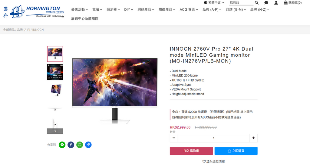 INNOCN 2760V Pro 27″ 4K Dual mode MiniLED Gaming monitor (MO-IN276VP/LB-MON),Innocn 雖然是國內品牌,但質素也獲得不少用家認同,這款 4K 電競屏幕會有 2304 個調光區,同樣支援 HDR 1000 標準,支援 4K160Hz 及 FHD320Hz 雙模式高屏刷率。售價僅 $2999。