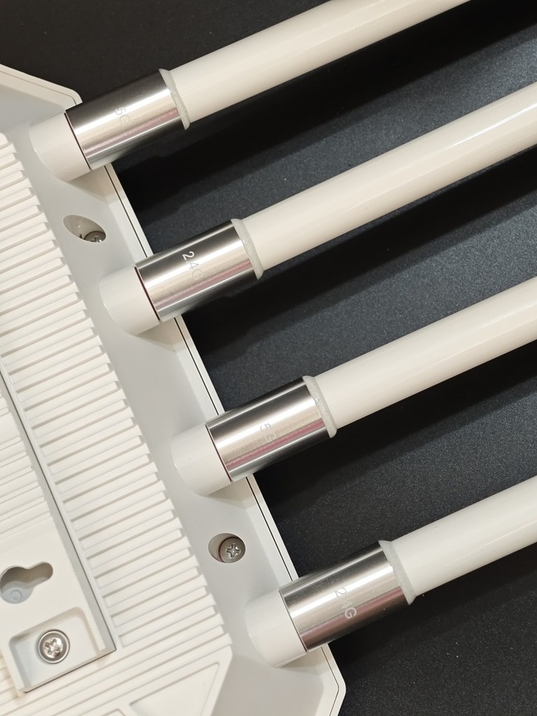 在信號覆蓋方面,WL-WN573HBE2 採用了「2+2+1」天線矩陣,機身外部矗立著四 4 根高增益全方向天線,外層材質選用了耐腐蝕的玻璃纖維。這 4 根天線被精確分配:其中 2 根為 2.4GHz 專用的 8dBi 全向天線,專注於提供極廣的覆蓋範圍與穿牆能力,確保在遠距離或有障礙物的情況下仍能維持基礎連線;另外 2 根則為 5GHz 專用的 8dBi 全向天線,負責承載高頻段的高速數據流量,實現遠距離的極速傳輸。