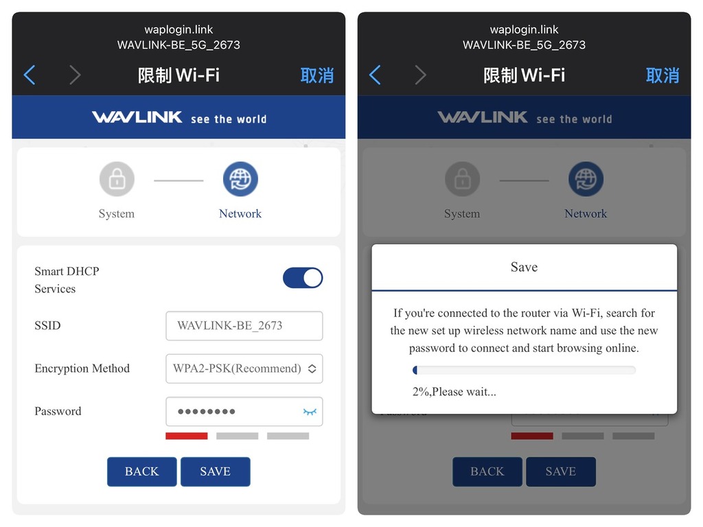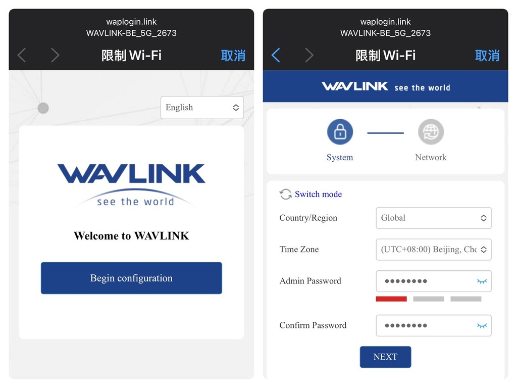 Wavlink 在這款產品上實現了「無電腦化」設定,用戶只需將設備接上電源,手機便能搜尋到一個開放的預設 Wi-Fi 名稱。連接後,手機瀏覽器會自動彈出引導頁面,即可開始設定。設定過程被精簡為極為直觀的三個步驟。首先是設定系統管理密碼與時區,接著是自訂 Wi-Fi 名稱 (SSID) 與加密密碼,最後系統會自動儲存並重啟。