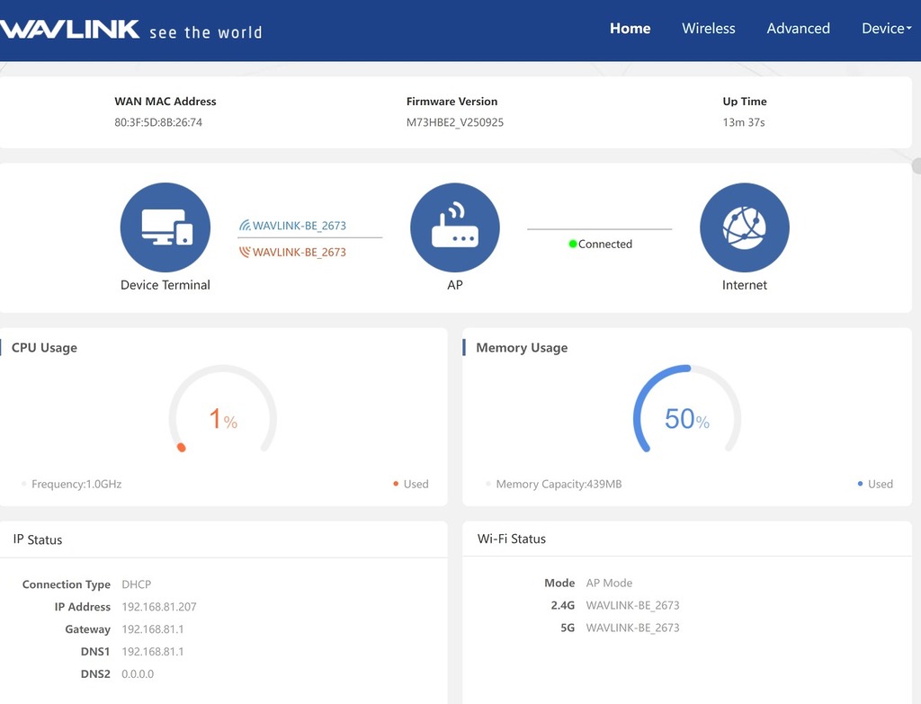 WL-WN573HBE2 不僅僅是一個單純的 Acess Point,更具備 Mesh Router 功能。系統支援多達 5 種工作模式,用戶可以將其設定為「Mesh Router」模式直接作為主路由器上網,或是作為「Mesh AP」融入現有的 Wavlink Mesh 網絡中,實現室內外的無縫漫遊。