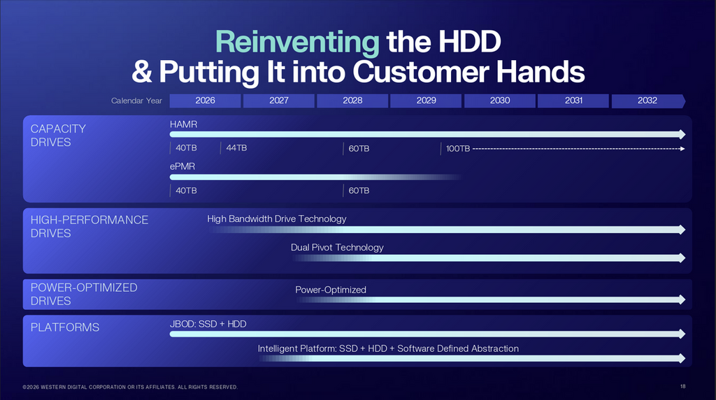 在不額外增加能耗的前提下,WD 會透過 HAMR 創新,把 ePMR 容量推高至 60TB,之後再在同一技術平台上把單碟容量擴展至 100TB,時間點定在 2029 年。全線 ePMR 與 HAMR 建基於共通架構,目標是同時提升製造效率與產量,亦讓客戶可在相同平台上「無痛」切換不同代際產品。