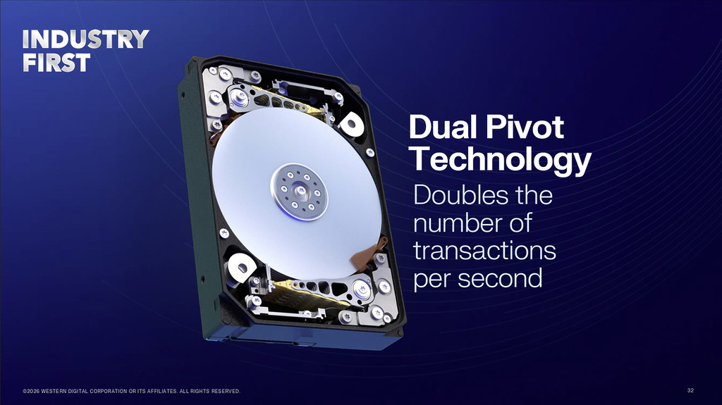 在容量藍圖之外,WD 亦同步展示 HDD 效能路線圖,希望縮小與 QLC 快閃之間的距離,讓部分原本只會放在 SSD 上的 AI 工作負載可以回流至 HDD 層。公司提出兩項關鍵技術:High Bandwidth Drive Technology 及 Dual Pivot Technology,目標是在不犧牲 HDD 經濟效益的前提下,把頻寬與 IO 效能「加碼」。